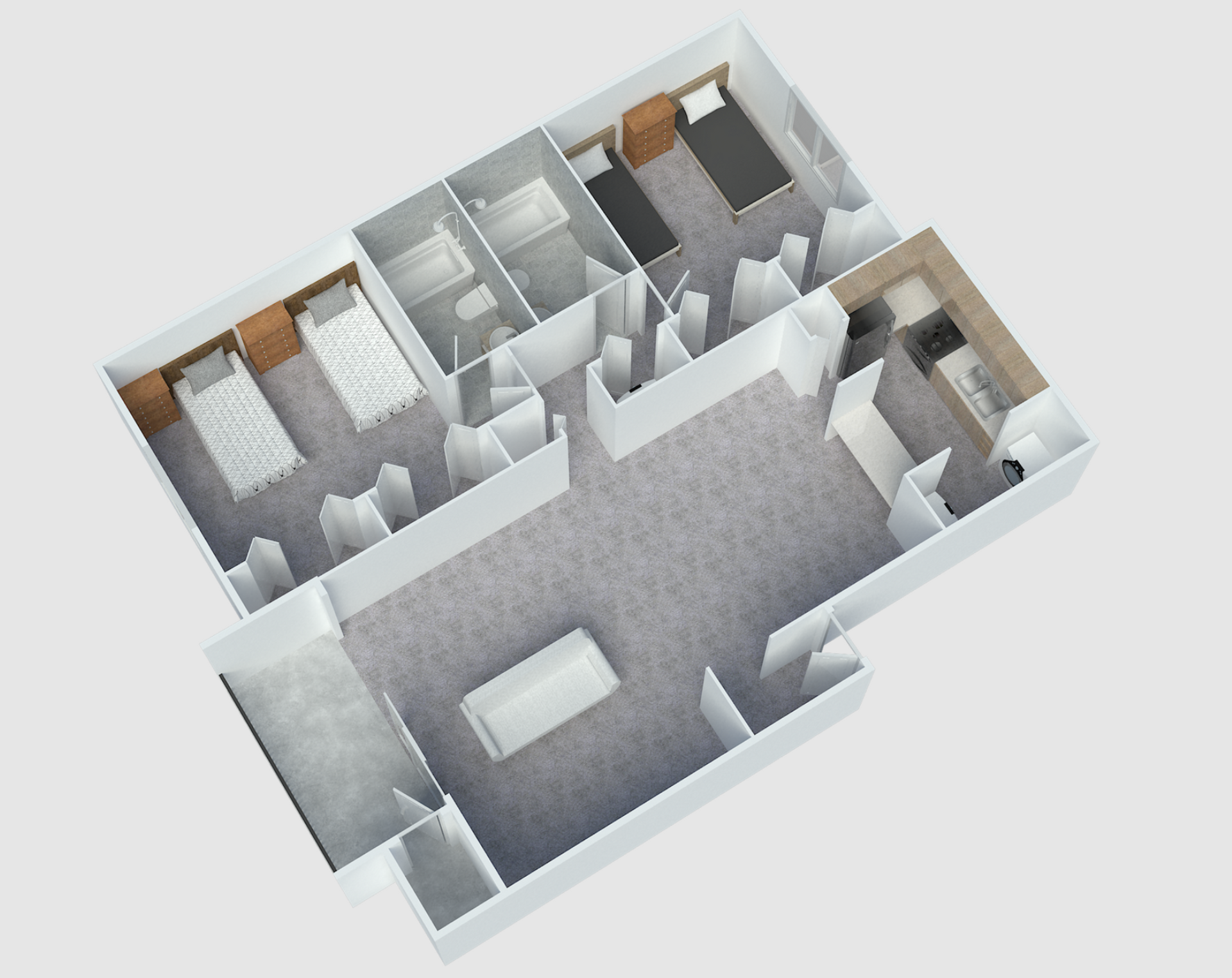 Each occupant in the apartment has an individual lease and is not responsible for the vacancy or delinquency of the other occupied beds. Each occupant will have a twin-sized bed, dresser, and shared living room furniture. The utilities that are included in the rent are electricity and water.